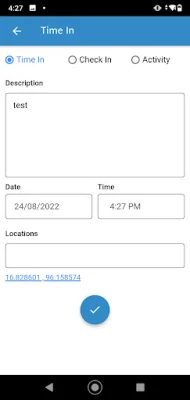 Time In form contain employee's location with latitude and longitude, in/out time, in/out date.