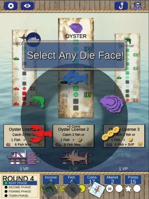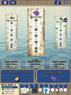 In the boat phase, the active player rolls players plus one boat dice. In turn order, each player selects one die to use immediately. By selecting a boat die, they get to check off the matching boat type on their sheet - unlocking license powers and boat launches to catch fish. The die that remains after all players have selected is then used by all players.