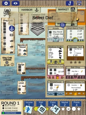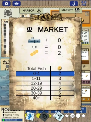 In the town phase, you roll town dice equal to players plus one boat die. Again, in turn order each player selects one die to use immediately. In the town phase, you unlock special buildings in the Wharf that grant bonuses, awesome ships in the harbor to earn points and catch more fish, or go to the market and gain income to generate bonus actions. The die that remains after all players have selected is then used by all players.