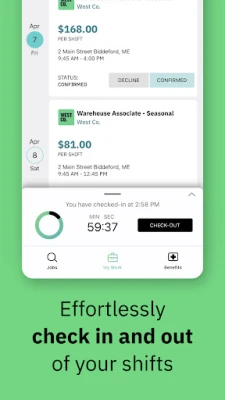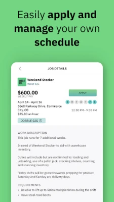 View job details, such as exact location, estimated total pay, shift hours, and requirements, before applying.