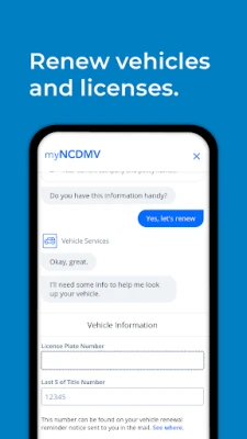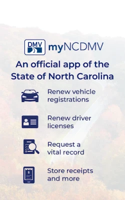 Download the official app of North Carolina - myNCDMV - to renew your vehicle, pay vehicle property tax, order duplicate registration, or order personal/specialized plates---with the help of a friendly chatbot! This take the hassle out of getting the necessary certificates with a click of a button or two. Select order by mail or pick up in the office and get notified when it is ready. myNCDMV is offered as a convenience to residents of North Carolina.