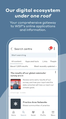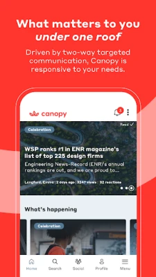 Canopy's mobile app connects you and every WSP employee with the people, information, and resources you need, whether on a work site, away from your desk or on the go. Find and share information instantly and stay updated with essential knowledge, announcements, and news. Respond and react to content and interact with your colleagues and the WSP community. Access our people network and search through engaging and detailed profiles.