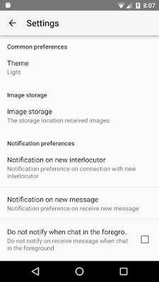 Main features: • choose themes (light, dark) • choose the gender, age and language of communication • text and image messages • notification about connecting and receiving message • saving a conversation • copy text in the chat • recognition of links