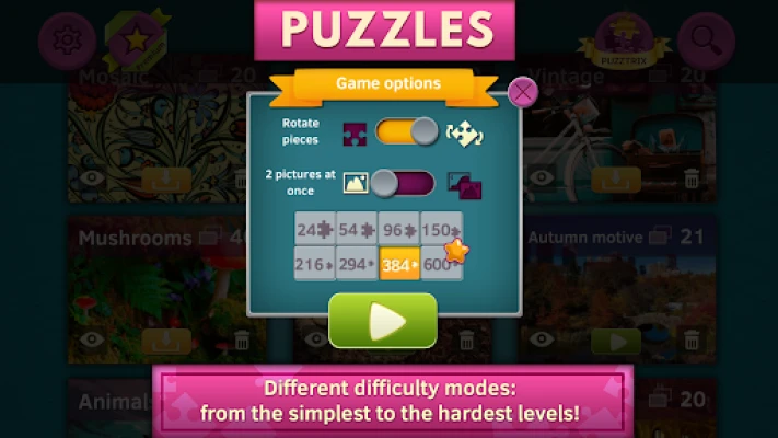 - 8 difficulty modes jigsaw puzzles with levels suit for all ages starting from easy to difficult for experts;