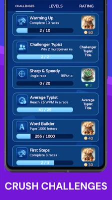 • Fun challenges like “Type Sprint,” “Marathon,” and “Accuracy Challenge” — perfect for a quick typing test or focused typing practice